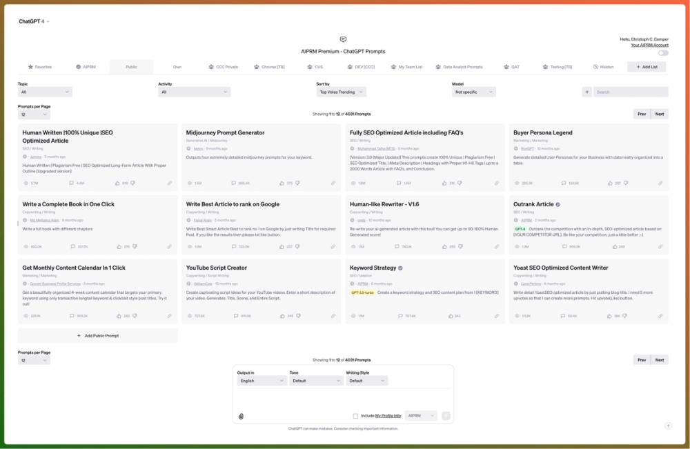 AIPRM is a powerful prompt management tool and community-driven library designed to significantly boost productivity with leading AI models such as ChatGPT, Claude, Midjourney, and DALL-E 3. It acts as a "cheat code" for users, providing access to a vast repository of over 4000 expertly crafted prompts that are rigorously reviewed and approved by a dedicated AI community. Key features include a high-quality public prompt library, the ability to create and organize private prompts for continuous individual or team use, and seamless integration with Custom GPTs to enhance prompt management. AIPRM aims to streamline workflows, enabling users to complete tasks across marketing, sales, operations, productivity, and customer support in minutes rather than hours. Its widespread adoption by over 2 million users and major global brands underscores its effectiveness in delivering efficient and affordable AI solutions.
