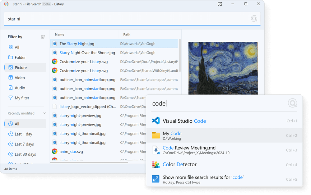 - Instant File Search: Quickly locate any file on your drive with results displayed in milliseconds, prioritized by your habits.